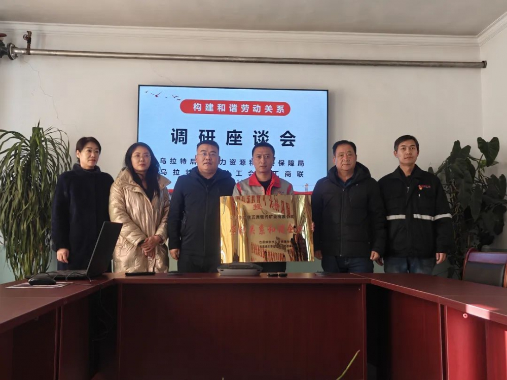12月25日,乌拉特后旗人社局党委书记、局长敖日格乐,总工会副主席潘莹,工商联副主席马述敏等一行人到访,在公司二楼会议室开展座谈会并进行“劳动关系和谐企业”授牌仪式,公司党支部副书记、经理史小亮,职能部室人员参加座谈会。