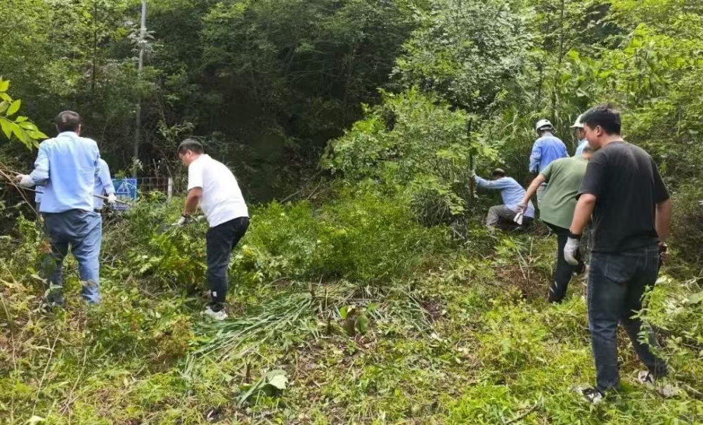 因长期停用,炸药库周边杂草丛生、灌木密布,部分区域杂草高达两米,不仅影响安全巡查,还存在多种风险。现场,职工们手持割草机、镰刀、铁锹等工具,分工协作:年轻职工主动承担割草、砍伐重任,老员工则负责理碎石、搬运杂物,党员先锋们更是一马当先,带头攻坚复杂区域。尽管汗水浸透工装,双手磨出水泡,但无人喊苦叫累,展现出强大的团队凝聚力。